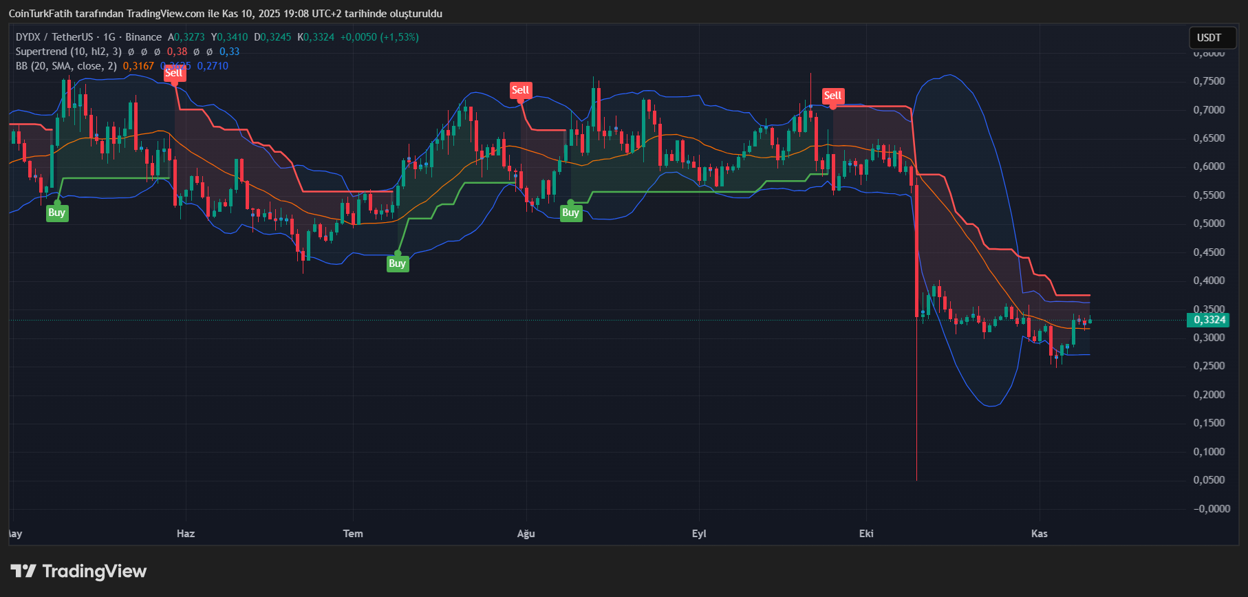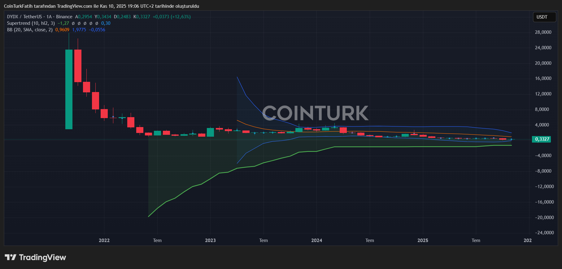 DYDX代币在创下历史新低后,现正试图突破0.36美元并挑战0.55美元关口。考虑到当前市值低迷、持仓量萎缩及用户参与度下降,这一目标能否实现尚存疑问。若能止跌回升并形成最终峰值,突破0.55美元后或将测试0.8至1.21美元区间。若市场情绪持续回暖,价格甚至可能冲击1.87-2.73美元区间。