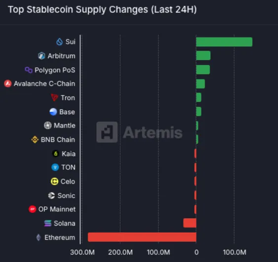 Artemis数据显示,周二,Sui在过去24小时内的稳定币流入量在所有区块链中位居榜首。具体而言,该网络上的稳定币总供应量已突破10亿美元大关。Mysten Labs联合创始人兼首席产品官Adeniyi Abiodun在周二发布的帖子中表示:"Sui Network在过去24小时内以1.48亿美元的净稳定币流入量位居榜首。"