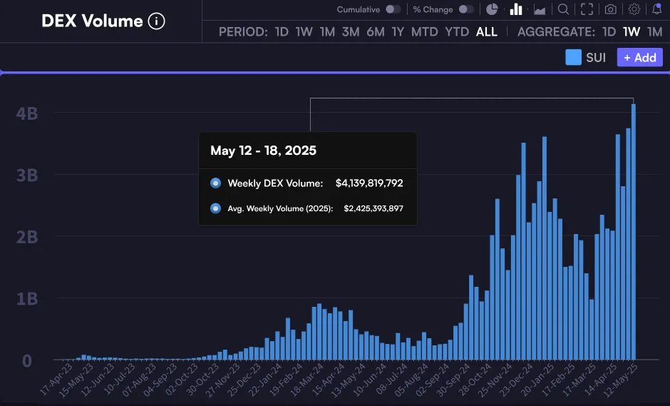 Mysten Labs是Sui Network的创建者,这是一个专注于高吞吐量和低延迟的第一层平台。与此同时,Sui的周交易量也创下新高,这表明整个网络中的用户活跃度和流动性都在急剧上升。链上分析师ToreroRomero在帖子中表示:"Sui在周DEX交易量上创下历史新高。"