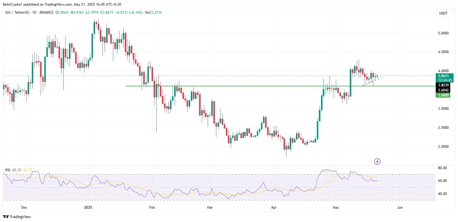 技术市场信号也反映了看涨的基本面。根据Rose Premium Signals的数据,尽管目前出现回调,但SUI的价格走势依然强劲。他们在X上表示:"Sui正在保持其倒头肩形态的突破。在突破3.65-3.75美元的颈线后,价格推升至3.94美元,现在正在回调,重新测试突破区域……目标保持不变:第一目标4.76美元,第二目标5.67美元。保持在3.65-3.70美元上方确认了强势。"