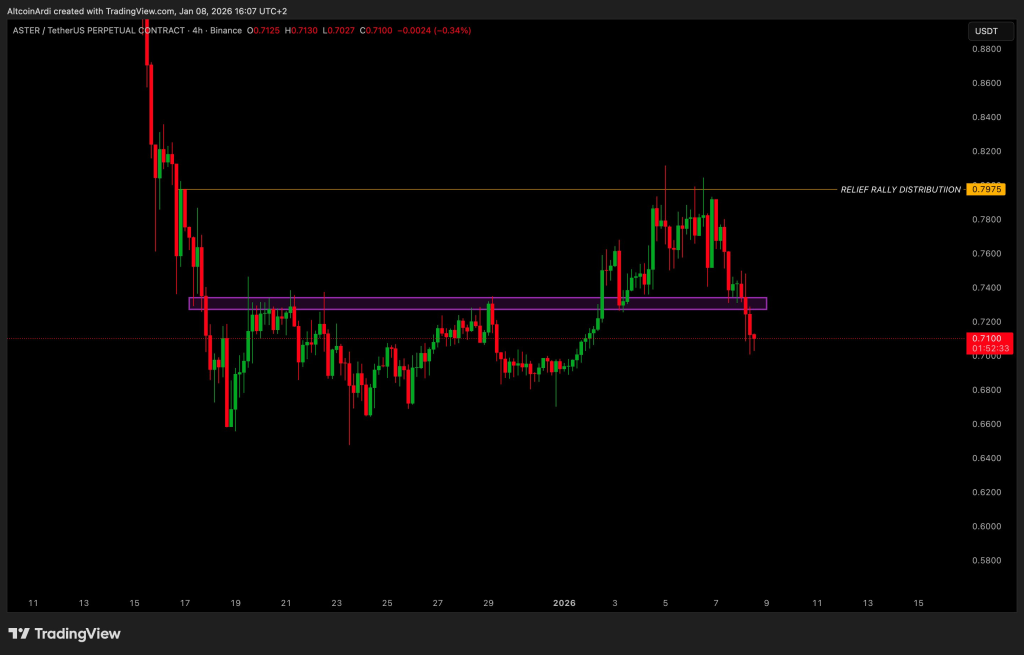 最引人注目的是当前价格走势与12月预判的高度同步性。技术反弹、上探头顶阻力、撤回区间低点——所有这些阶段均在图表中清晰可见。Aster价格至今未脱离该剧本上演意外行情。这种一致性虽不能断言后续发展,却解释了为何Ardi持续参照同一路线图。附带图表使其第二篇分析更易理解,表明市场正逐步遵循而非随机穿越这些关键位。