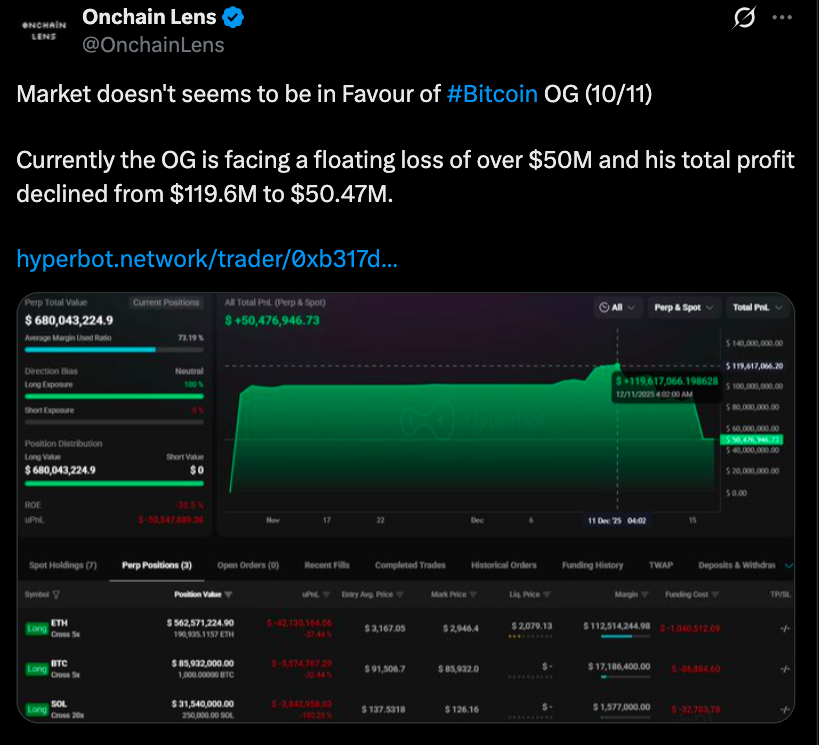 答:亏损源于在BTC、ETH和SOL上的重度杠杆多头头寸,随着2025年12月价格下跌而出现亏损。