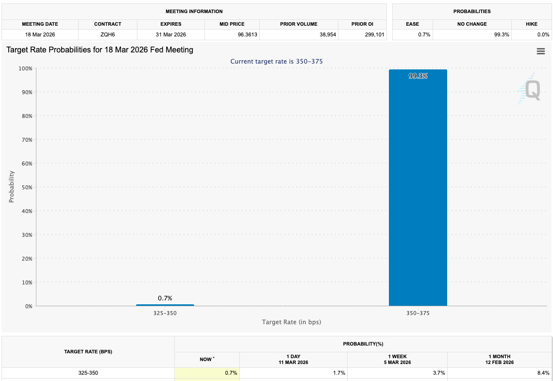 最新通胀数据未改变市场对美联储政策的预期。CME集团FedWatch工具数据显示,3月18日美联储会议降息概率——这一潜在加密货币利好因素——已降至不足1%。