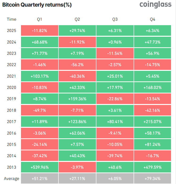 显然,"上涨十月"效应及机构强劲需求助推了这波涨势。历史数据显示,BTC在10月及第四季度通常表现亮眼。CoinGlass数据显示,自2013年以来比特币10月平均回报率达21%,第四季度平均回报率更高达79%。