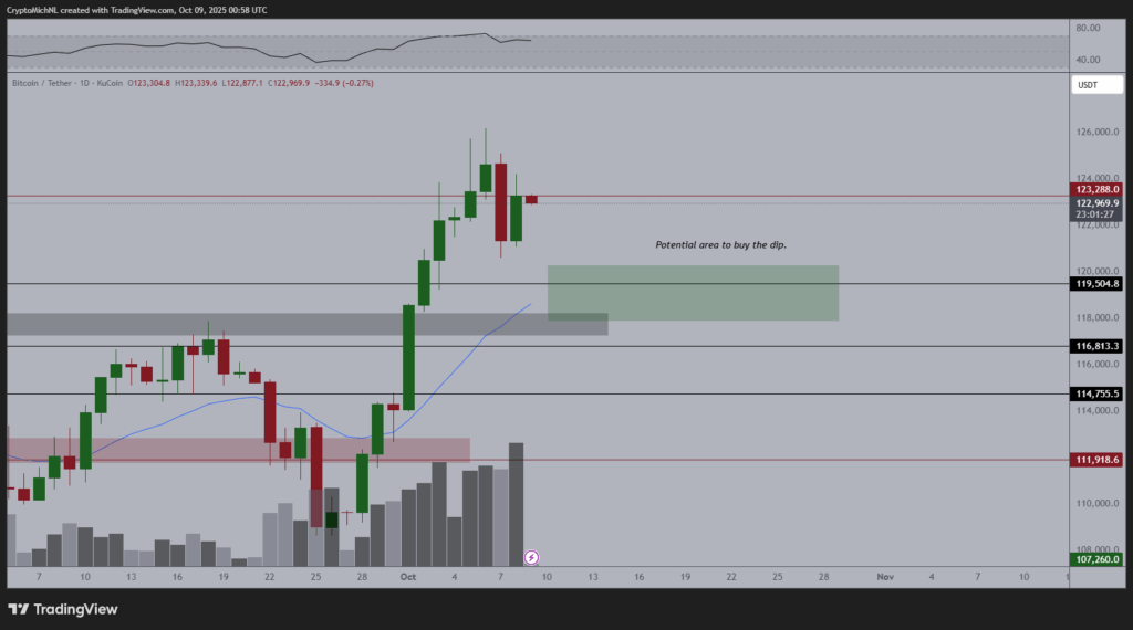 随着比特币价格回调,市场观察人士正密切关注其后续走势。分析师Michael van de Poppe指出,BTC必须守住12.1万美元支撑位才能避免深度回调。若该位置失守,下一支撑位见于119,504美元,这同时是"潜在买入区域"。
