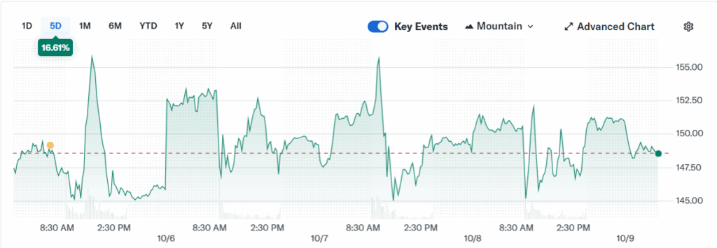 随着比特币本周创下新高,Circle股票过去五日上涨近17%。10月8日CRCL收报150.46美元,单日涨幅1.17%。
