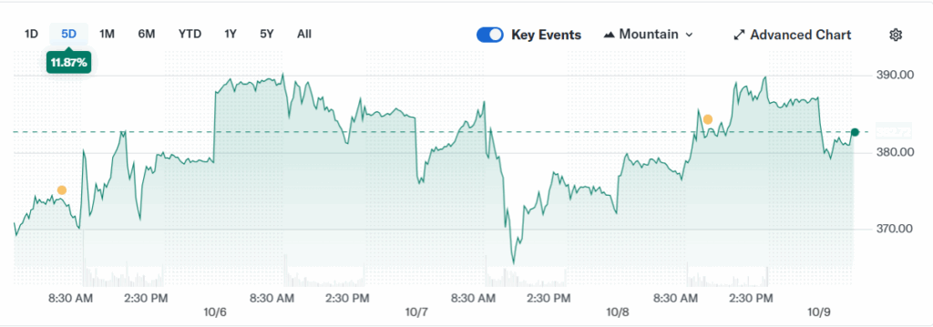 同期Coinbase股票10月8日收于387.27美元,单日涨幅超3%。过去五日累计上涨近12%,显示投资者热情高涨。