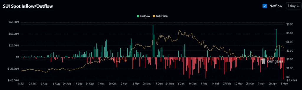 自4月28日以来,SUI现货流量大幅转向流出,导致流出加密货币的流动性不断增加。5月2日,SUI现货流出量飙升至3720万美元,达到6个多月以来的最高水平,凸显了过去7天的流出规模。