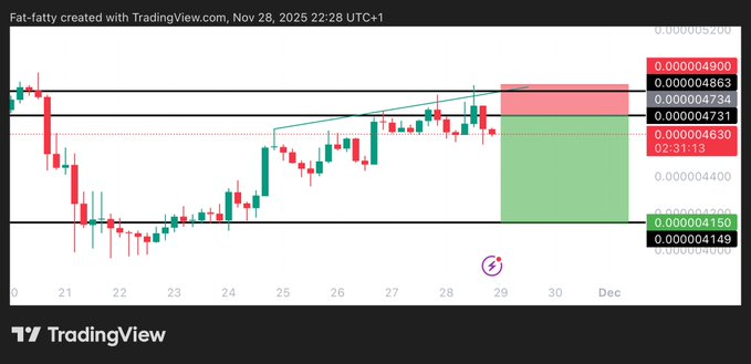 建议的止损位设在0.0004928美元,位于影线区域上方,该区域的结构将发生转变。突破该水平将使压缩阶段失效。目标位0.000415美元对应最后一个显著的积累区块和之前的整理区域。