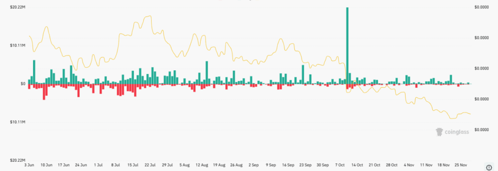 PEPE总清算图表记录了更广泛的市场压力。早期多头清算主导,反映出交易者受突然下跌冲击。每次向下突破都清除了过度扩张的头寸,因为价格走弱。