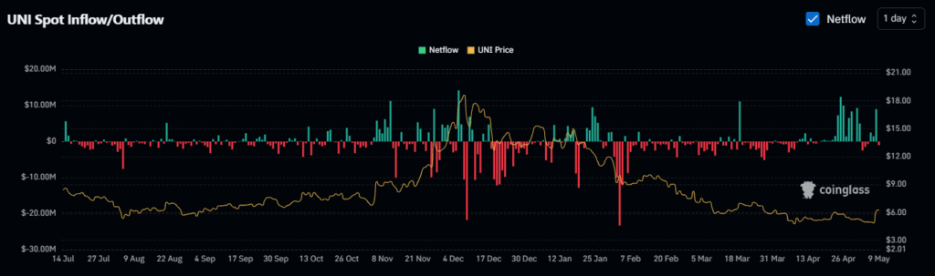 有趣的是,Uniswap的现货流入在4月下旬开始积累,尽管价格持续下跌直至近期低点。换句话说,UNI的最新上涨得到了不断膨胀的需求浪潮的支持,表明市场情绪正在转变。