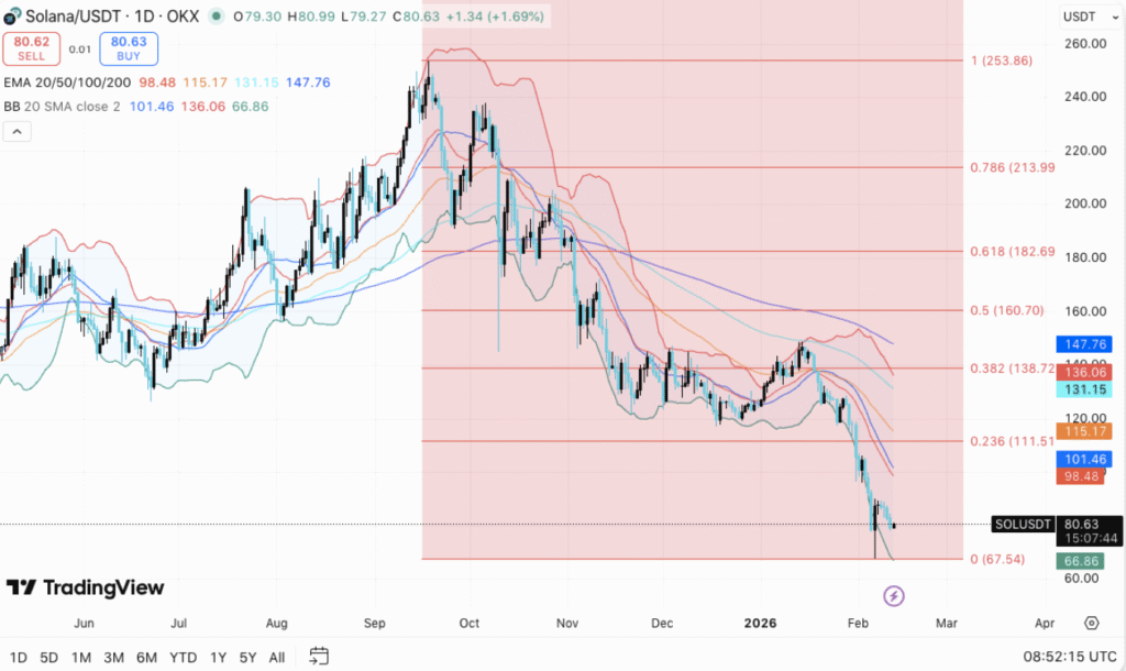 在经历了数月的持续下跌压力后,Solana价格目前徘徊在80美元上方。由于未能收复253美元的高点,该代币已形成显著下降趋势,价格持续走出更低的高点和更低的低点。市场情绪的转变目前明显有利于卖方,尤其在较高时间框架上。