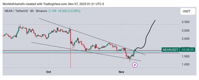 NEAR Protocol近期图表形态呈现明显的趋势转变。自9月末形成的下降楔形最终被强势突破,价格站稳2.00美元关键位上方。该形态通常预示盘整阶段结束,并开启新一轮上涨周期。World of Charts指出,NEAR在突破楔形上轨趋势线同时,成功守稳1.80-1.90美元水平支撑位。这种持续压缩后的放量突破,反映出交易者信心正在增强——若成交量持续配合,此类突破往往伴随后续上涨行情。