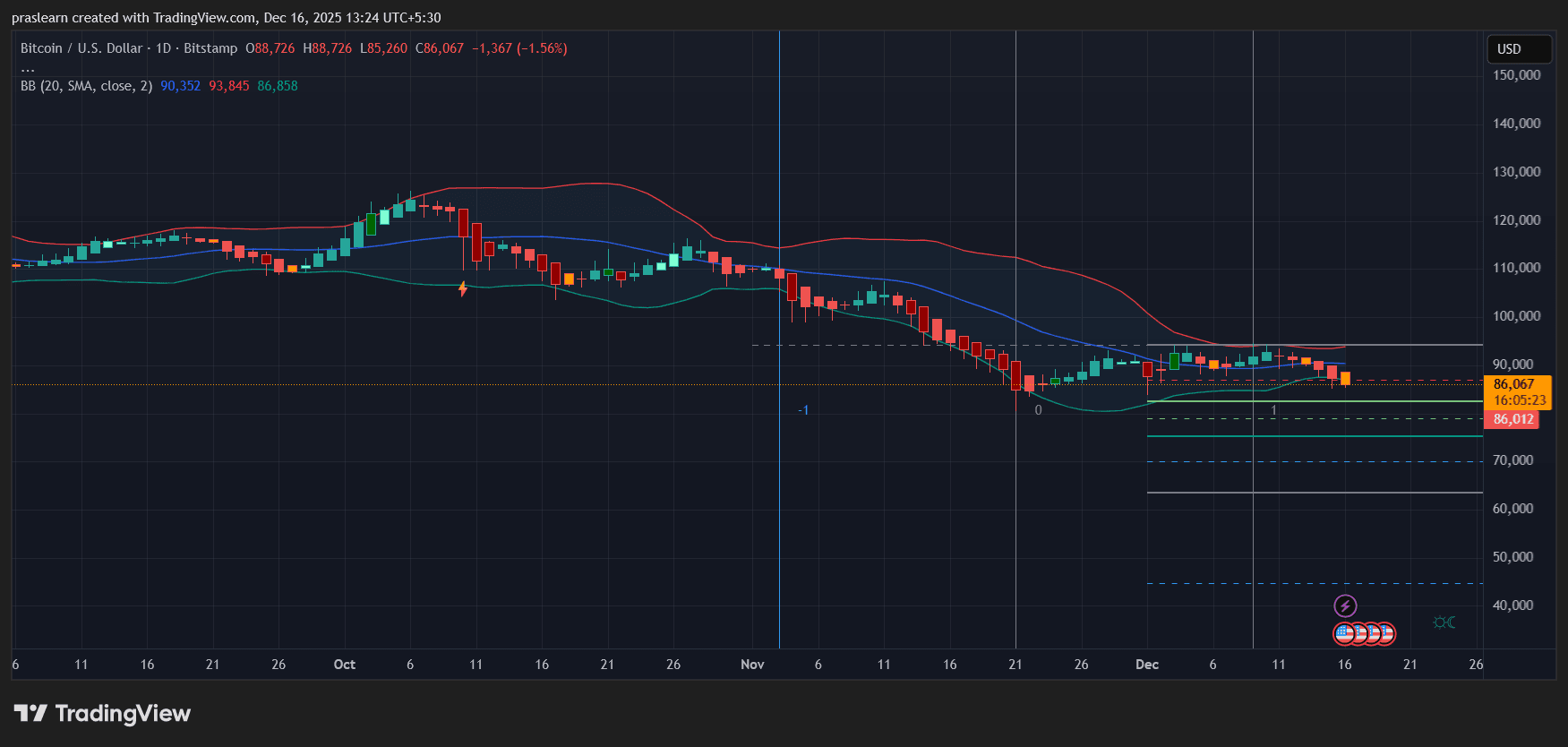随着主要市场在2025年最后一个完整交易周开局走低,比特币价格再度面临压力。周一,纳斯达克、标普500和道指悉数回吐早盘涨幅,人工智能相关科技股拖累市场情绪走弱。这股疲软态势已蔓延至加密货币领域,比特币目前交易价格接近86000美元,日内下跌约1.5%。让我们深入分析推动此轮走势的因素,以及图表揭示的未来动向。