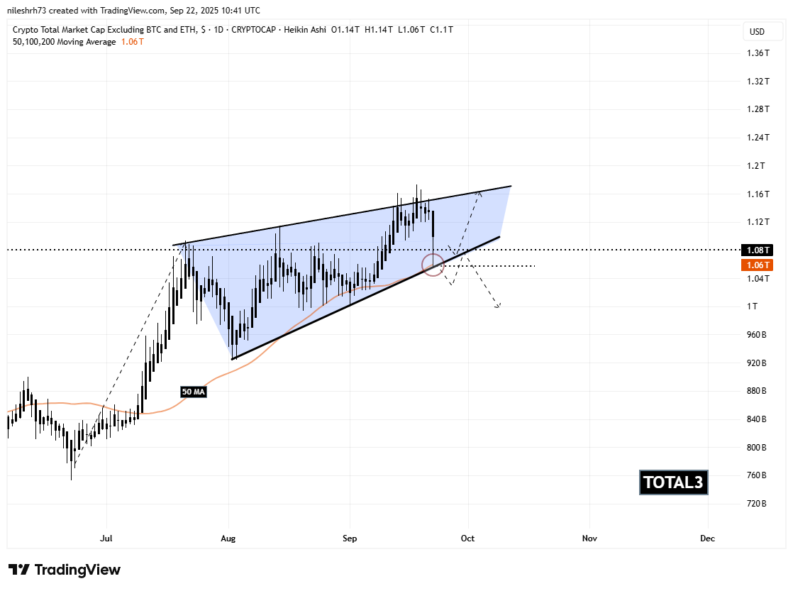 日线图上,TOTAL3始终在上升楔形形态内震荡整理——这种结构通常预示看跌反转或延续行情。当价格在1.17万亿美元附近遭遇上升阻力趋势线压制后,最新一轮抛售潮将市场打压至楔形下轨1.06万亿美元附近。该位置恰与50日均线重合,构成山寨币的关键支撑区域。
