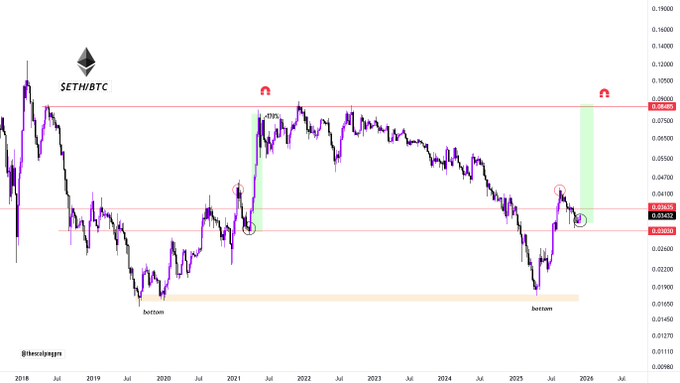 Mags在分析中指出,ETH/BTC触及的支撑位曾推动该交易对在七周内实现170%的暴涨。当时行情连续收出七根周线阳线后才进入缓慢派发阶段。当前与该支撑位的再次交互,使市场对这一重复模式关注度升温。
