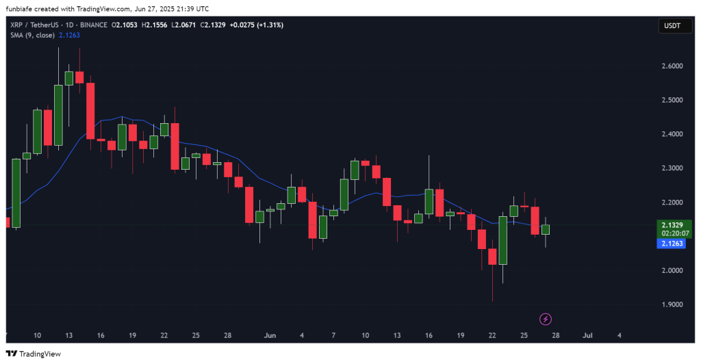 6月25日XRP曾试图通过一根强势阳线实现反弹,但后续未能延续攻势。最近两根K线实体较小且缺乏说服力,显示买家存在犹豫情绪。