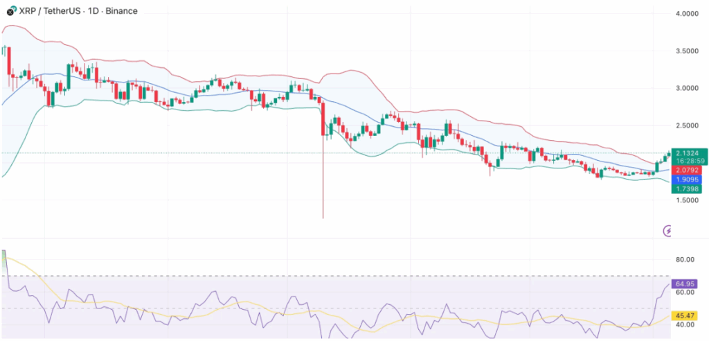 XRP目前维持在布林带中轨1.90美元上方,该位置已成为关键支撑位。相对强弱指数升至65,反映动能改善且未进入超买区间。若XRP能稳定在1.95美元上方,阻力位可能出现在2.25美元与2.50美元附近;而日收盘价低于1.90美元将削弱看涨预期,并可能重返更低支撑区域。