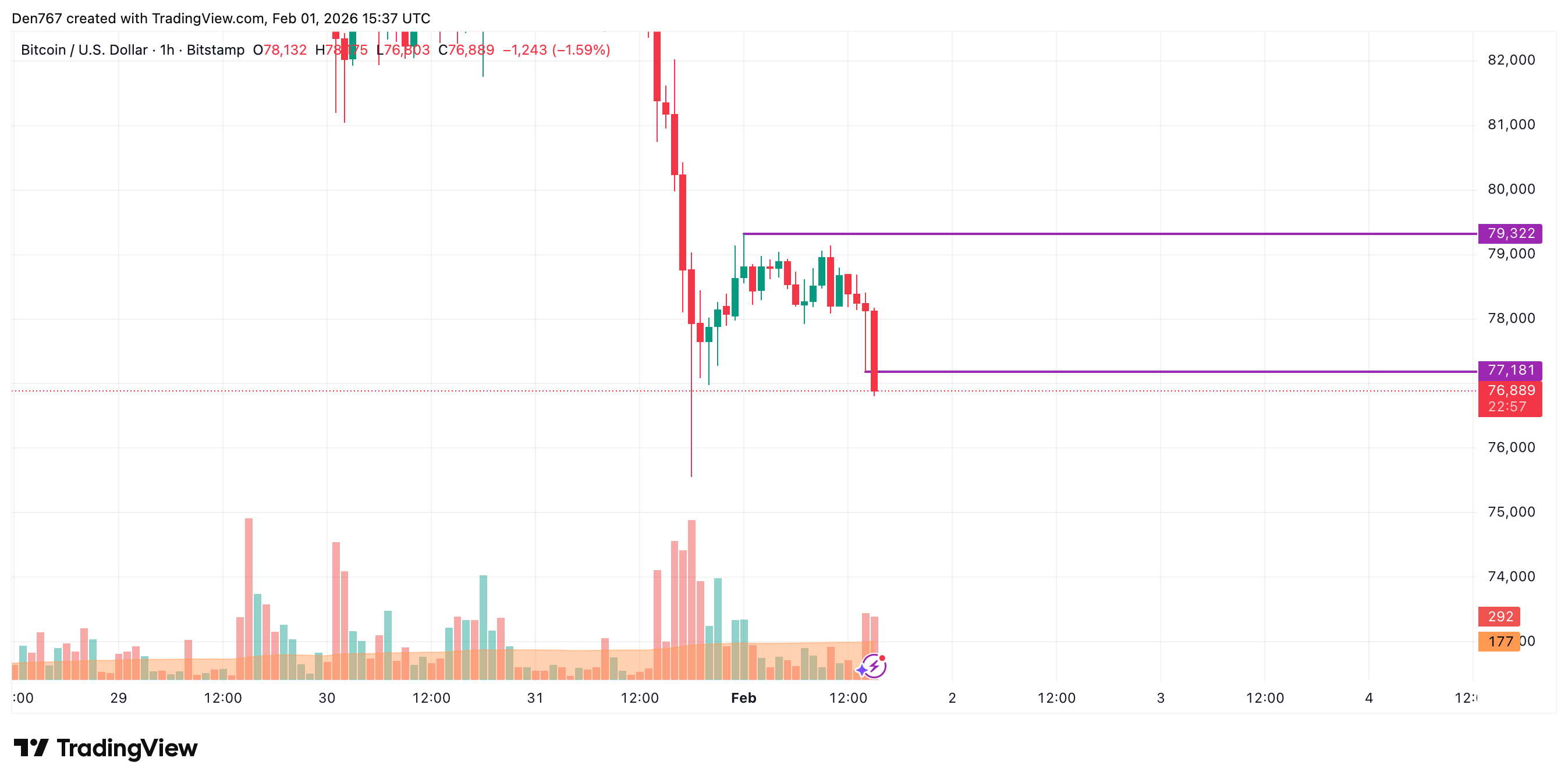 在小时线图上,BTC价格即将收于77,181美元的局部支撑位下方。如果跌破此处,下跌行情可能在未来一日内测试75,000至76,000美元区间。