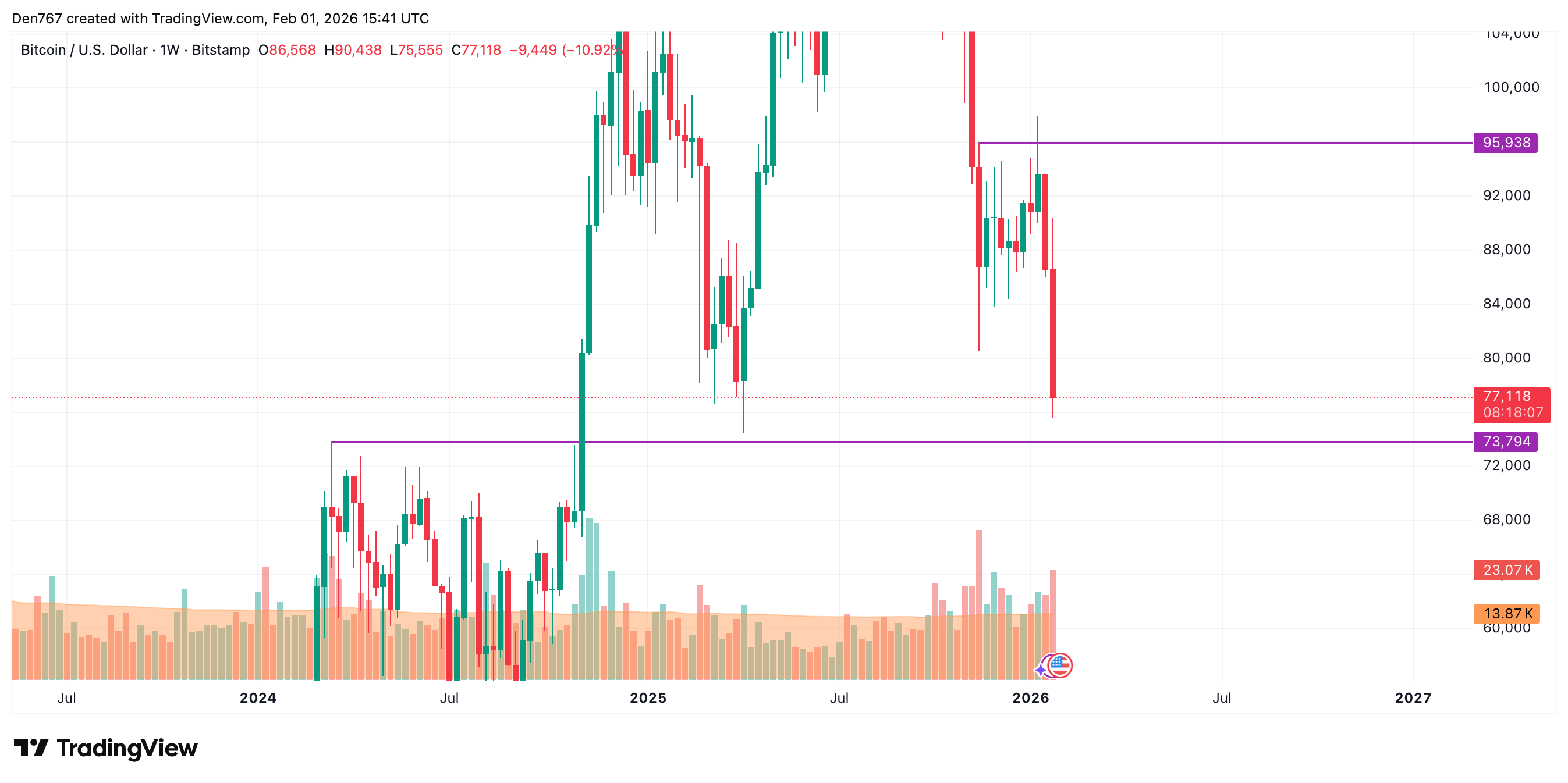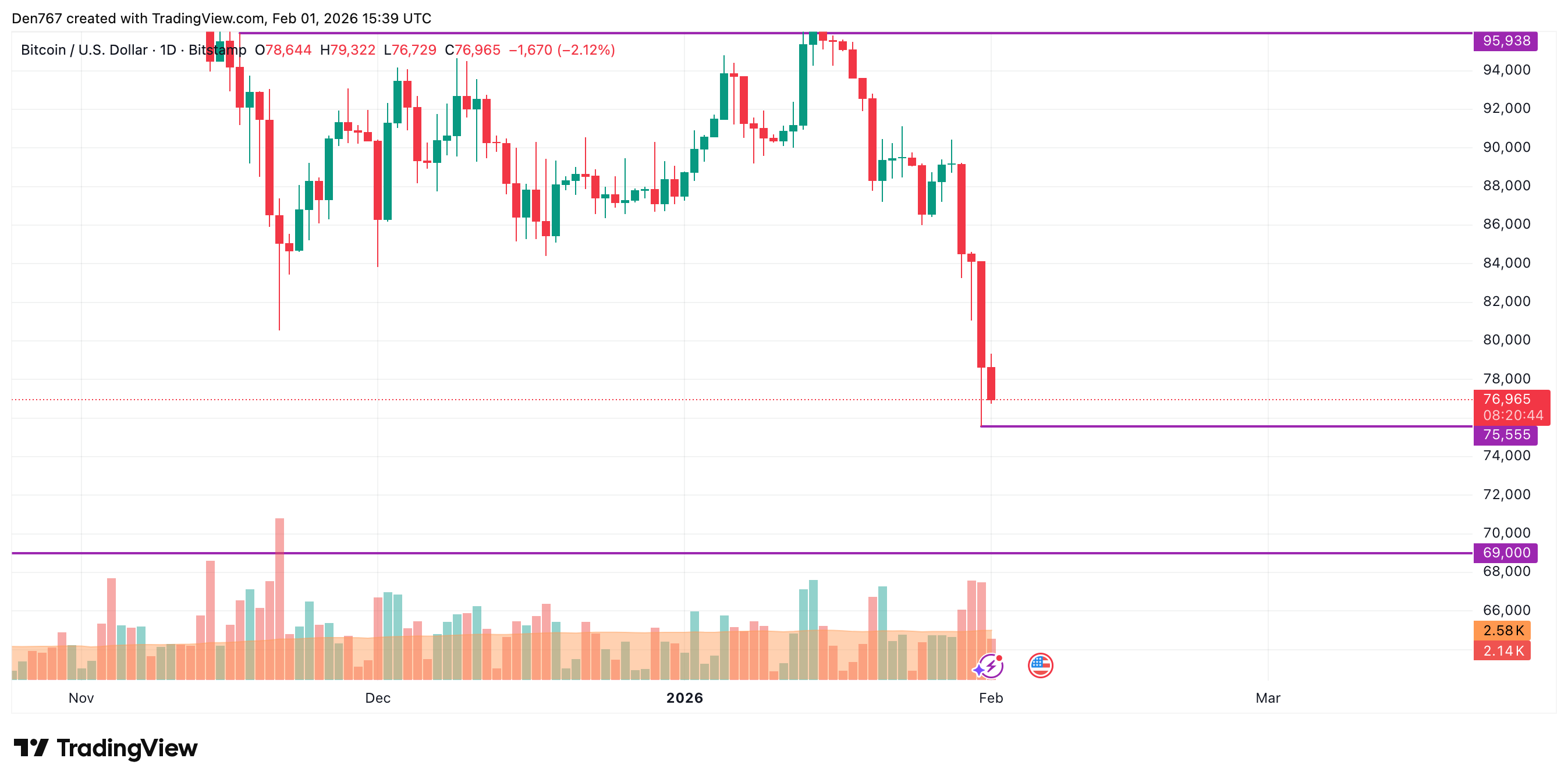 从更大时间框架观察,主要加密货币的价格已远离关键位置。在此情况下,应关注价格是否收于昨日低点之下。若收盘价低于75,555美元,跌势可能延续至70,000美元区间。