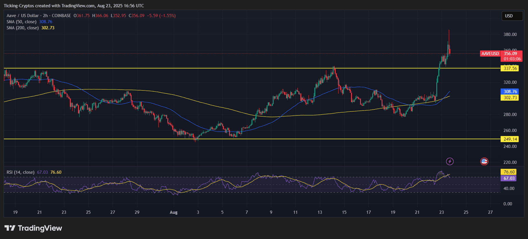 突破确认:AAVE明确突破337美元阻力位后,最高触及366美元区域,随后小幅回调