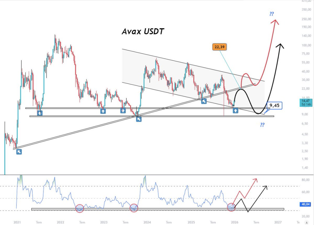目前市场正考虑AVAX价格的两种发展情景。根据分析,价格可能在下跌前首先升至22美元。第一种情景(称为黑箭头情景)显示,价格将暂时上涨至22美元左右,随后回落至9-10美元区间。这可能意味着底部正在形成并有望逐步企稳。