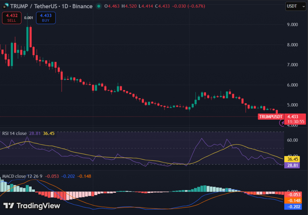 TRUMP币交易价接近4.41美元,下行趋势依然明确