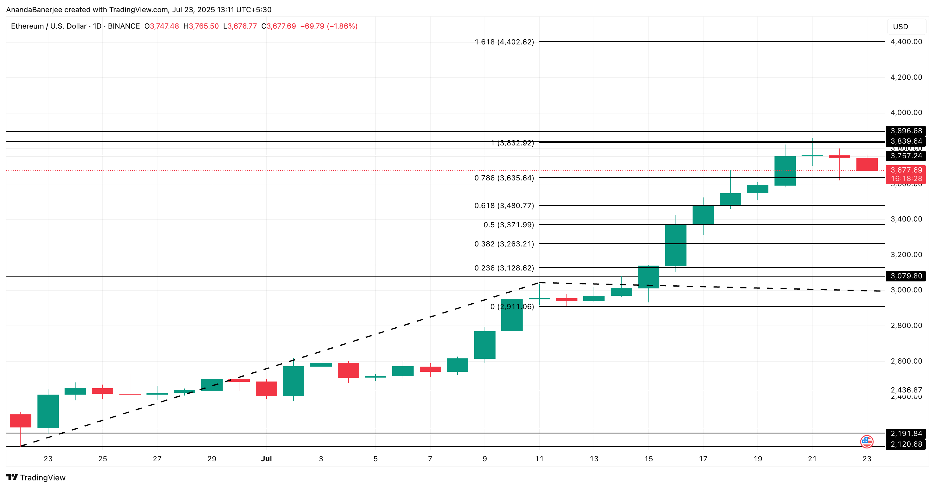 以太坊目前交投于3,832美元和3,635美元(0.786斐波那契位)两大关键区间。正如上限阻力位所示,真正的压力位恰位于"3,800美元关口"上方。但单纯突破3,832美元阻力可能效果有限,