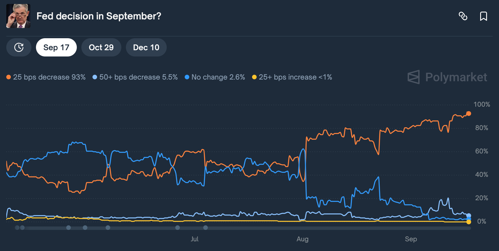 9月16-17日的美联储会议引发市场高度关注。Polymarket数据显示,9月17日FOMC会议降息25个基点的概率高达93%,维持利率不变的概率仅2.6%。货币政策宽松预期通常利好加密货币等风险资产。