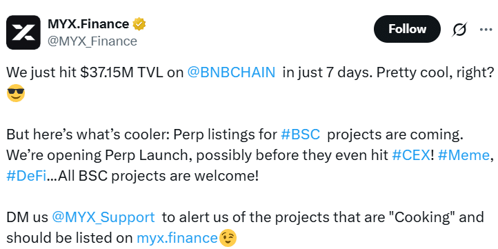 MYX Finance 达到 3715 万美元 TVL,来源:X