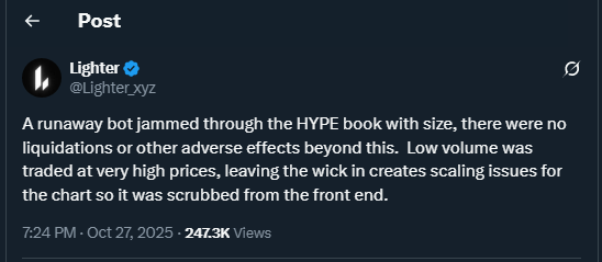 尽管Lighter从图表中移除夸张价格波动的决定旨在维护简洁界面,却引发加密社区批评。部分用户认为此举掩盖了流动性问题,可能削弱去中心化平台信任度。加密分析师Duo Nine评论其"隐藏了Lighter流动性真相",强调平台需在用户体验改进与完全透明间取得平衡。其他人士指出与交易者保持清晰沟通至关重要,尤其在代币价格受意外事件影响时。这场辩论还引发对交易所处理极端异常事件方式的思考。