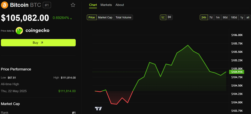 截至发稿,比特币价格报105,082美元,24小时上涨0.69%。