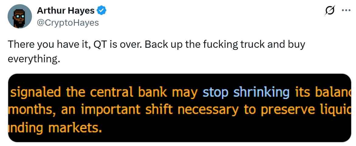 低利率环境通常通过降低借贷成本刺激风险资产(包括加密货币)上涨。此外,美联储计划12月1日结束量化紧缩(QT),可能为市场注入流动性,进一步支撑加密资产价格。