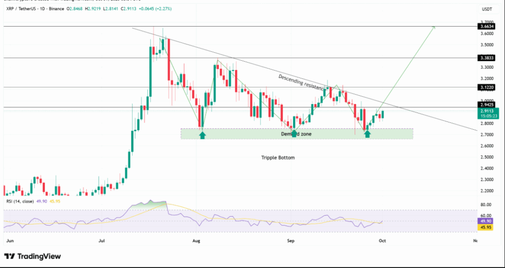当前XRP报价2.91美元,虽仍受制于压制前期上涨尝试的下降趋势线阻力,但三重底形态暗示空方力量正在衰竭。技术指标显示,若能突破当前阻力位,价格有望挑战3.66美元上方空间。
