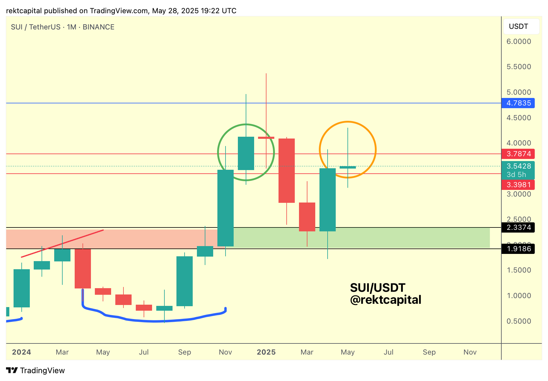 分析师在最新分析中指出,SUI/USDT在5月底的关键月线收盘后未能维持上涨势头。此前SUI曾有望复刻2024年末的牛市形态——当时价格在重新测试3.39美元支撑位后强势拉升。但本次代币未能守住防线,5月月线最终收于3.39美元下方,暗示潜在疲软态势。