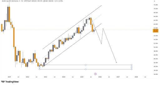 BTC.D指标在月线图上已跌破2025年中60-62%的支撑区间,暗示比特币对市场的掌控力可能减弱,资金或将开始流向山寨币。