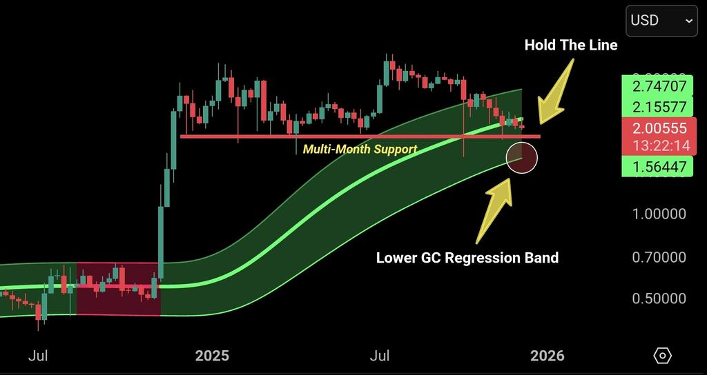 这正是XRP的现状——多头未失趋势但已失动能。若能收复2.15美元,将宣告买盘回归并开启通道内新一轮上攻。