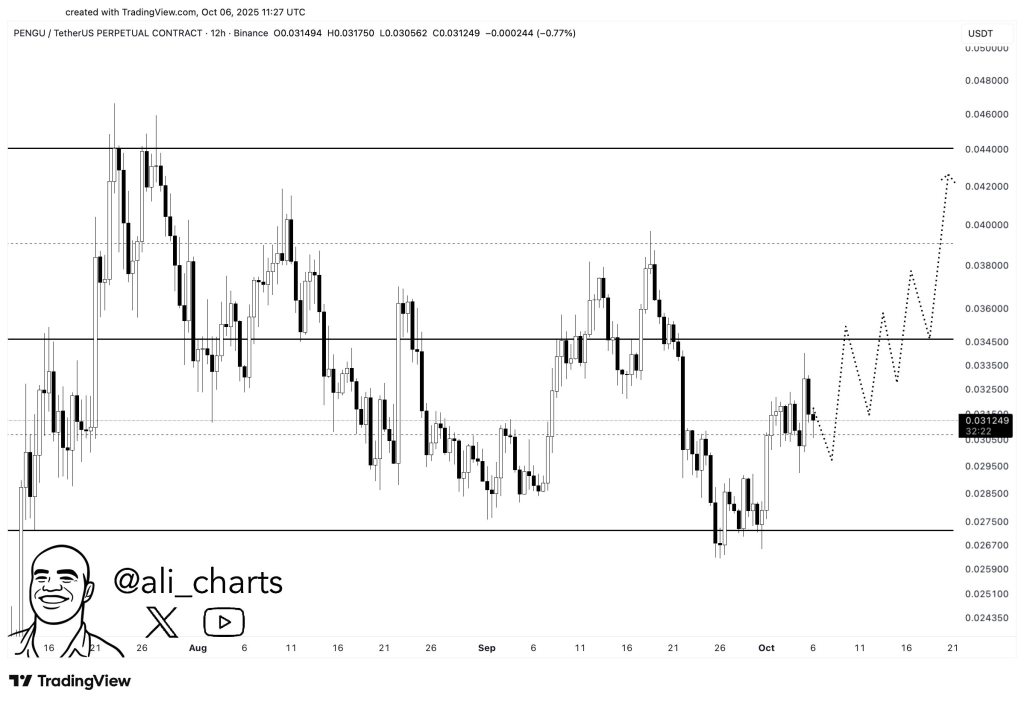 自8月中旬以来,Pudgy Penguins(PENGU)价格持续在0.026美元至0.046美元区间震荡,形成清晰的交易通道。X平台分析师Ali指出,当前币价正从通道底部反弹,下一目标位可能看向0.044美元。这一观察引发交易者的普遍关注:PENGU能否就此开启翻倍行情?