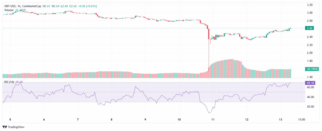 在本轮市场复苏中,瑞波币价格不仅突破2.6美元短期支撑位,更实现超10%涨幅。值得注意的是,在近期市场大规模清算背景下,XRP的表现成为行业焦点。全球加密市值现回升3%至38.7万亿美元,比特币重回115,000美元关口,以太坊同步反弹7%。衍生品数据同样显示市场参与者情绪转暖,CoinGlass数据显示XRP期货未平仓合约增长6%至43亿美元。但相对强弱指数(RSI)显示该资产已接近超买区域,可能引发短期回调压力。