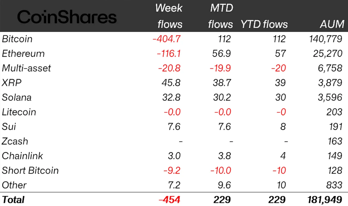欧洲加密资产管理公司CoinShares周一报告显示,上周加密货币交易所交易产品(ETPs)资金流出达4.54亿美元。