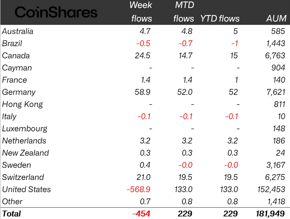相比之下,德国、加拿大与瑞士等多个国家分别获得约5900万、2500万和2100万美元资金流入。