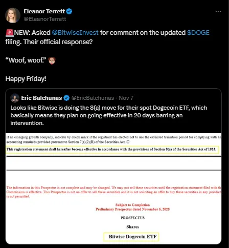 2025年11月6日,Bitwise资产管理公司参照狗狗币价格,向美国证券交易委员会提交了现货DOGE交易所交易基金申请。该公司采用《证券法》第8(a)条款,若SEC未在20日内提出异议,该申请将自动生效。
