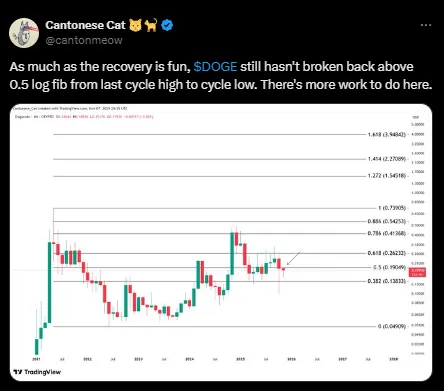 现货DOGE ETF若获批,将为流动性高、认知度广的代币提供无需钱包、密钥或交易所账户的投资渠道。交易员同时密切关注价格图表关键位——分析师CantoneseCat指出,DOGE尚未收复上一周期高点到低点的0.5对数斐波那契回撤位。