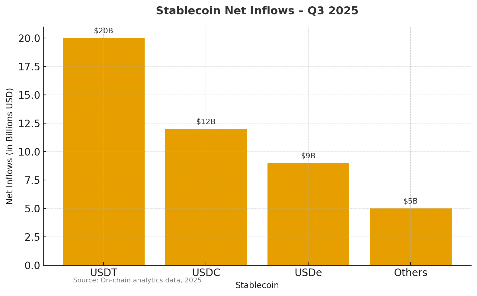 稳定币流通量同步快速增长。当季净流入(发行量与赎回量之差)增加460亿美元,其中USDT以200亿新增发行量领先,USDC和USDe分别以120亿和90亿美元紧随其后。这既反映了对锚定机制的信心,也表明市场将稳定币视为加密波动中的避风港。