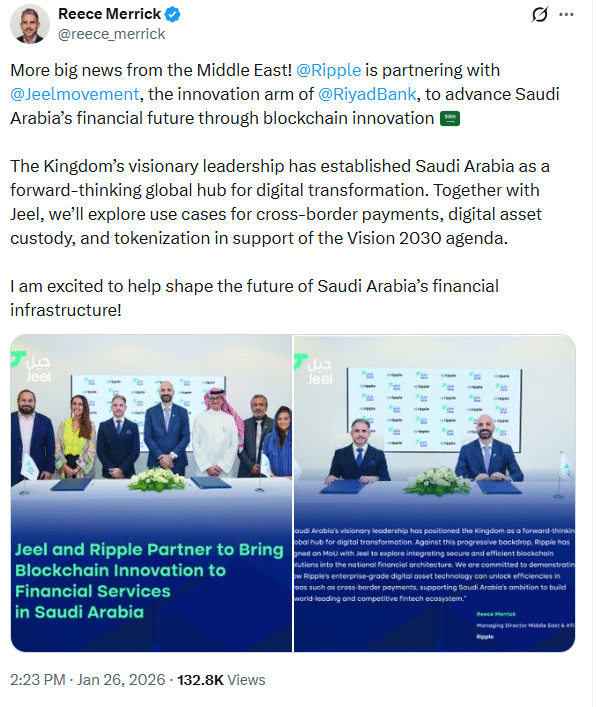 该平台已在整个中东地区建立了合作关系。与沙特的协议加强了其区域布局。机构采用仍是瑞波战略的核心。此次合作支持的是长期基础设施发展,而非投机。