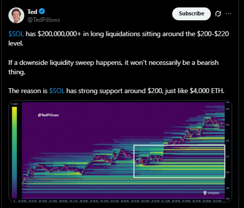 市场观察员TedPillows表示,200美元区域类似于今年以太坊4000美元的心理支撑位。他认为任何回调至该区间的走势都可能吸引逢低买盘。待市场消化该区域流动性后,随着未平仓合约重置,涨势往往加速。
