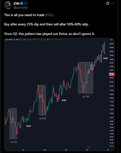 分析师ZYN发现SOL存在重复的价格模式:通常在回调约25%后,会在接下来数周内反弹50-60%。自2024年年中以来该模式已出现三次,与当前价格走势高度吻合。