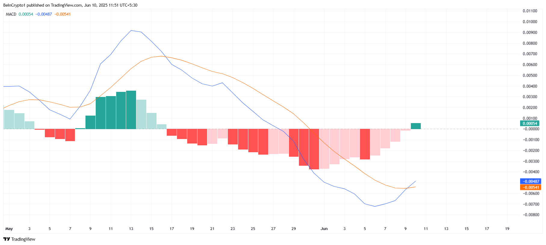 当前MACD(异同移动平均线)指标正显现看涨金叉,标志着持续三周多的死叉趋势终结。当MACD线上穿信号线时,往往预示着动能反转,这将有助于遏制损失。对于关注代币价格走势的交易者而言,这一转变尤为重要。