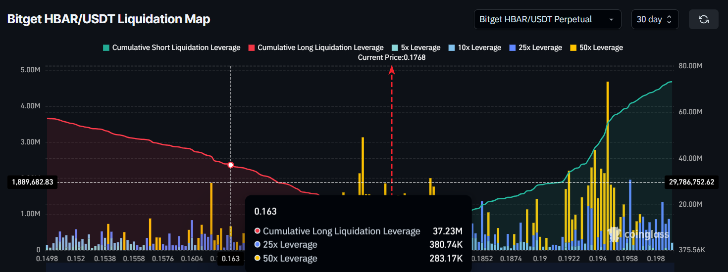 清算地图进一步印证了近期价格走势对HBAR交易者的重要性。若价格跌至0.163美元的下一个支撑位,可能导致3720万美元的多头仓位爆仓。所幸看涨金叉的出现及时缓解了压力,避免了价格滑向关键支撑位。