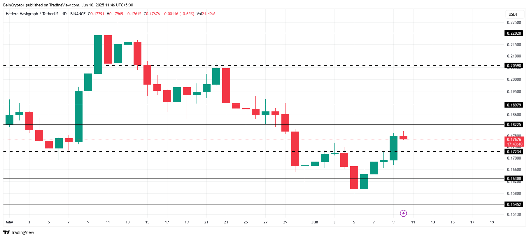 截至撰稿时,HBAR报价0.176美元,略低于0.182美元的阻力位。看涨金叉与技术指标的双重支撑,可能帮助其突破这一关口。一旦成功,该山寨币或将持续攀升,挑战更高阻力位。